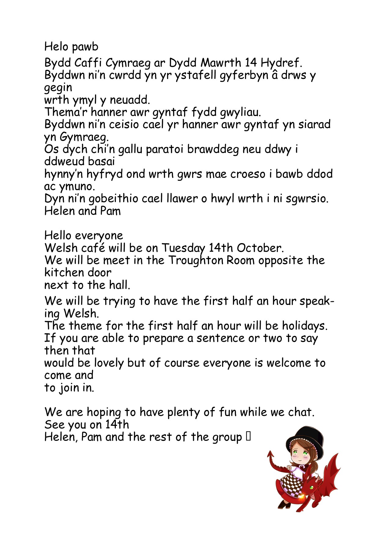 Welsh Cafe – every 2nd Tuesday in the month 10.30 – 12.00